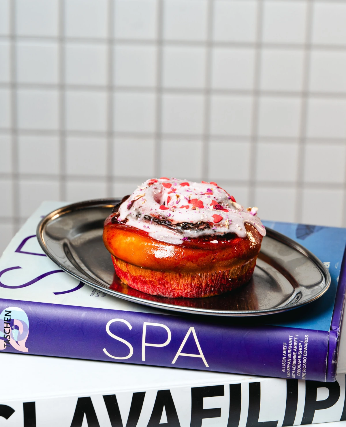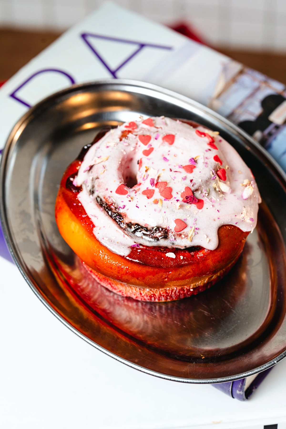Очень клубничная сдобная булка, которой тоже можно очень эффектно признаться в любви или просто порадовать себя на завтрак. Сдобное тесто бриошь, начинка из пюре клубники, клубничный сироп и клубничная глазурь. Все это украшено сахарными сердечками и лепестками розы.